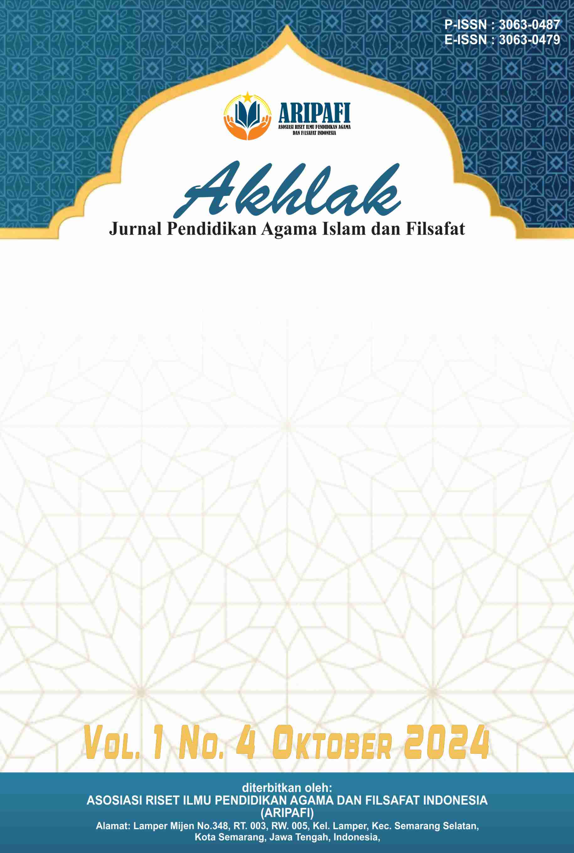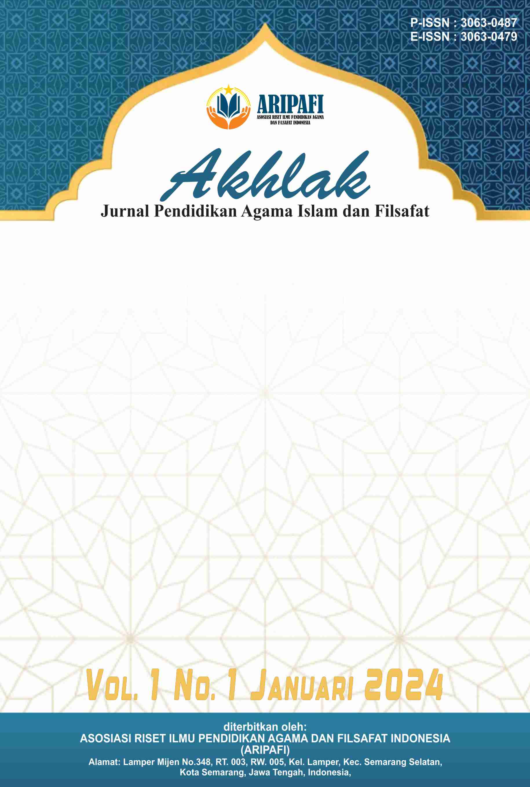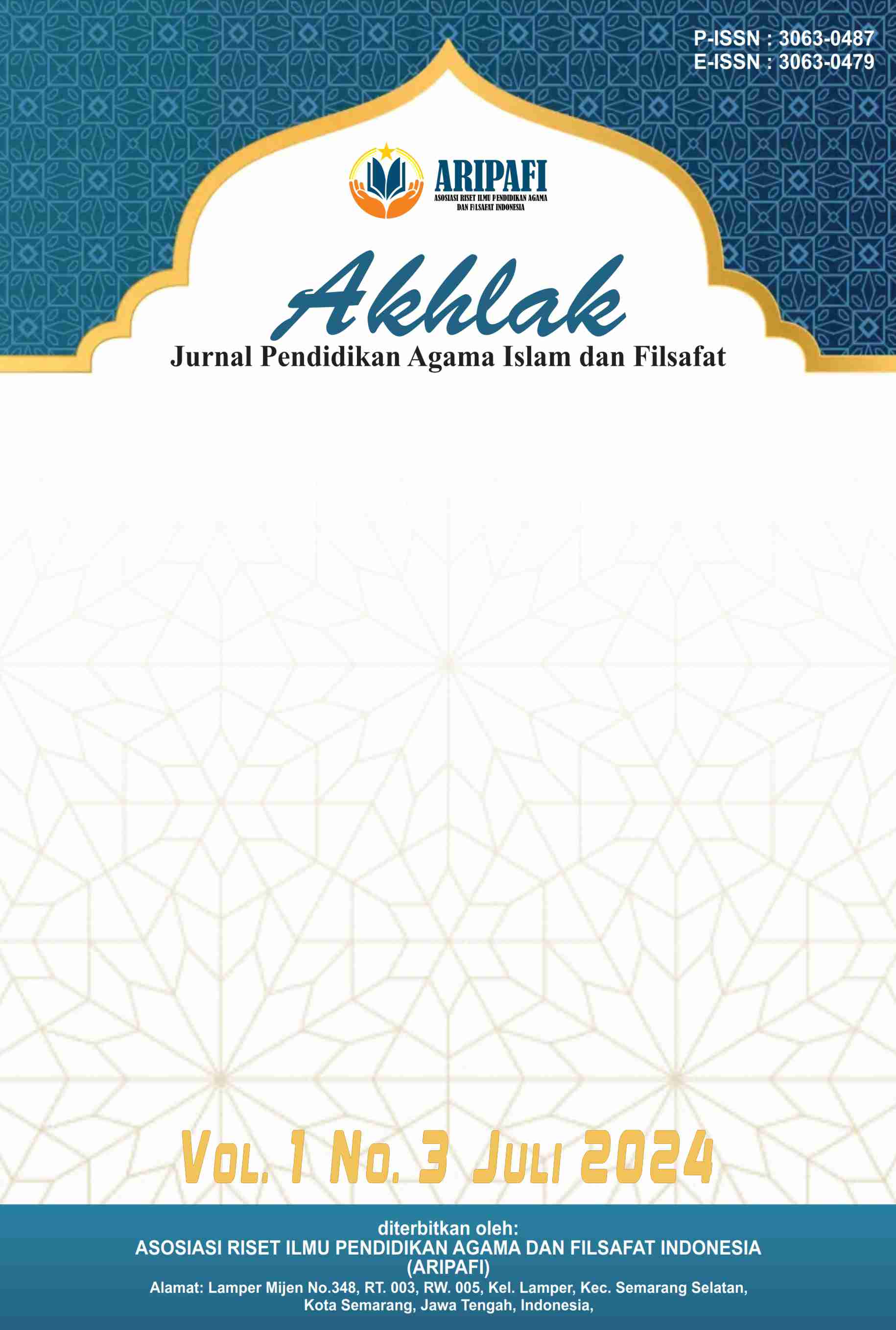 Vol. 1 No. 1 (2024)Akhlak : Jurnal Pendidikan Agama Islam dan Filsafat, Jurnal ini ditujukan untuk publikasi artikel ilmiah yang diterbitkan oleh Asosiasi Riset Ilmu Pendidikan Agama dan Filsafat Indonesia. Jurnal ini merupakan wadah akademik yang menggali konsep-konsep dalam bidang pendidikan agama Islam dan filsafat dengan fokus pada aspek akhlak (moralitas dan etika). Dengan menggabungkan perspektif keagamaan dan filsafat, jurnal ini bertujuan untuk menyajikan pemikiran-pemikiran mendalam tentang bagaimana agama Islam dan filsafat dapat membentuk karakter dan perilaku manusia. Artikel-artikel dalam jurnal ini mencakup berbagai topik, mulai dari teori-teori akhlak dalam Islam hingga penerapan praktisnya dalam pendidikan dan kehidupan sehari-hari. Penulis dalam jurnal ini mungkin membahas tentang konsep-konsep seperti akhlak al-Qur'an, akhlak Rasulullah, nilai-nilai moral dalam filsafat Islam, serta metode-metode pendidikan agama Islam yang bertujuan untuk membentuk karakter yang baik pada individu. Jurnal ini terbit 1 tahun 4 kali (Januari, April, Juli, dan Oktober).