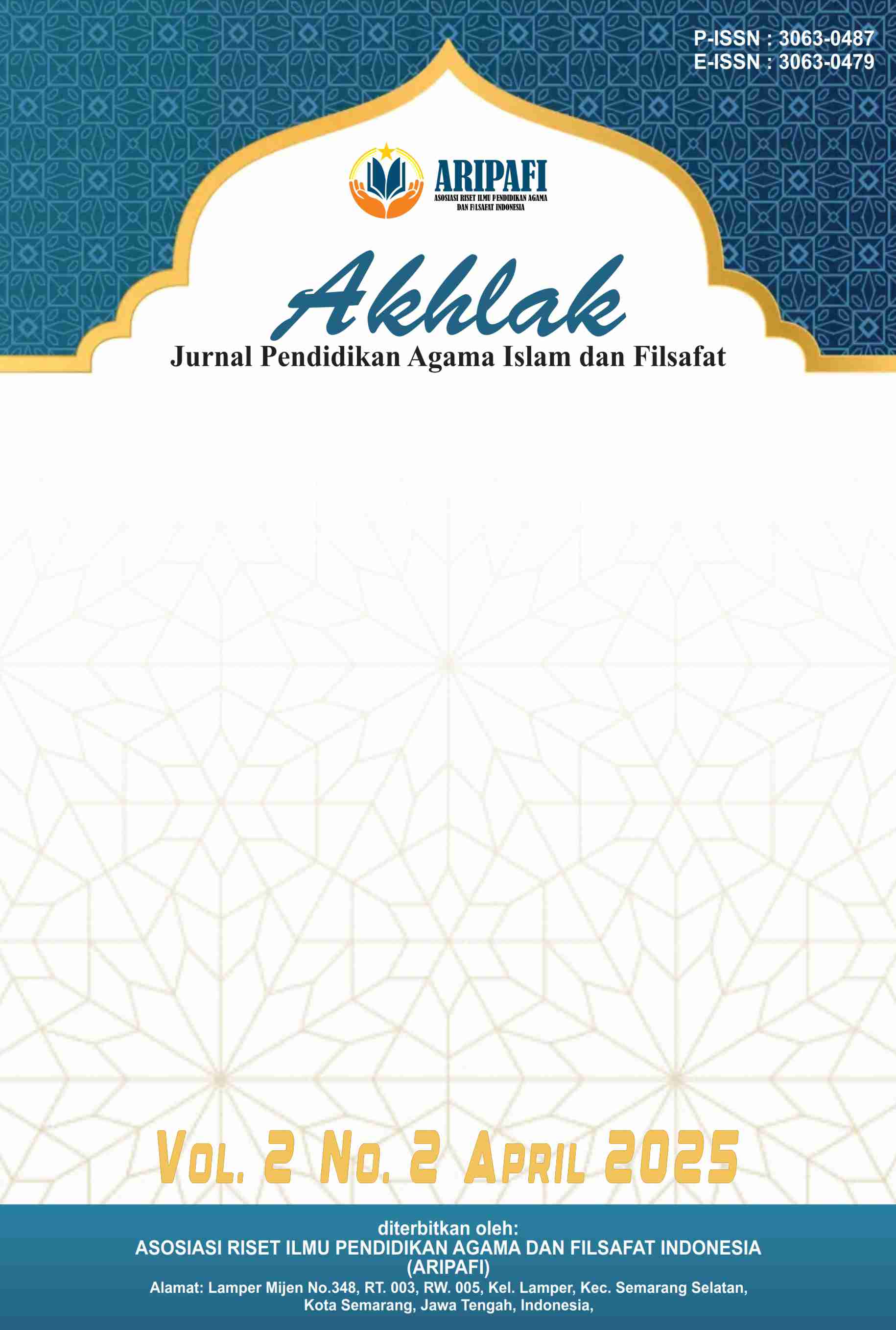Vol. 2 No. 2 (2025)Akhlak : Jurnal Pendidikan Agama Islam dan Filsafat, Jurnal ini ditujukan untuk publikasi artikel ilmiah yang diterbitkan oleh Asosiasi Riset Ilmu Pendidikan Agama dan Filsafat Indonesia. Jurnal ini merupakan wadah akademik yang menggali konsep-konsep dalam bidang pendidikan agama Islam dan filsafat dengan fokus pada aspek akhlak (moralitas dan etika). Dengan menggabungkan perspektif keagamaan dan filsafat, jurnal ini bertujuan untuk menyajikan pemikiran-pemikiran mendalam tentang bagaimana agama Islam dan filsafat dapat membentuk karakter dan perilaku manusia. Artikel-artikel dalam jurnal ini mencakup berbagai topik, mulai dari teori-teori akhlak dalam Islam hingga penerapan praktisnya dalam pendidikan dan kehidupan sehari-hari. Penulis dalam jurnal ini mungkin membahas tentang konsep-konsep seperti akhlak al-Qur'an, akhlak Rasulullah, nilai-nilai moral dalam filsafat Islam, serta metode-metode pendidikan agama Islam yang bertujuan untuk membentuk karakter yang baik pada individu. Jurnal ini terbit 1 tahun 4 kali (Januari, April, Juli, dan Oktober).