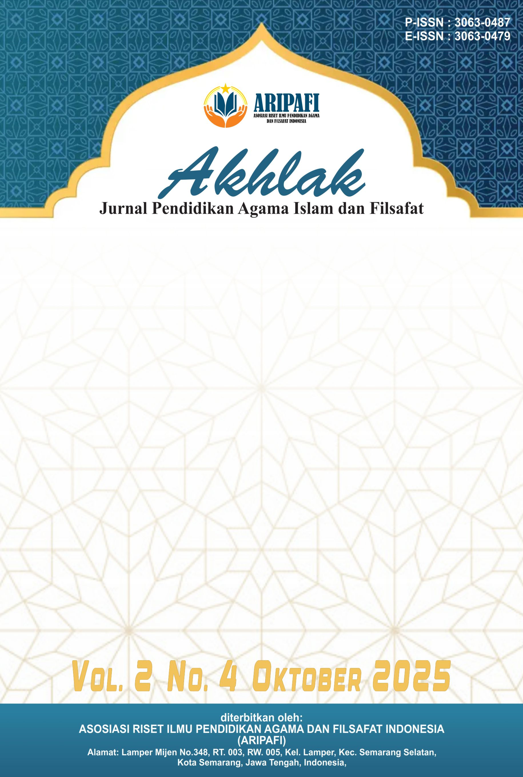 Vol. 3 No. 1 (2026)Akhlak : Jurnal Pendidikan Agama Islam dan Filsafat, Jurnal ini ditujukan untuk publikasi artikel ilmiah yang diterbitkan oleh Asosiasi Riset Ilmu Pendidikan Agama dan Filsafat Indonesia. Jurnal ini merupakan wadah akademik yang menggali konsep-konsep dalam bidang pendidikan agama Islam dan filsafat dengan fokus pada aspek akhlak (moralitas dan etika). Dengan menggabungkan perspektif keagamaan dan filsafat, jurnal ini bertujuan untuk menyajikan pemikiran-pemikiran mendalam tentang bagaimana agama Islam dan filsafat dapat membentuk karakter dan perilaku manusia. Artikel-artikel dalam jurnal ini mencakup berbagai topik, mulai dari teori-teori akhlak dalam Islam hingga penerapan praktisnya dalam pendidikan dan kehidupan sehari-hari. Penulis dalam jurnal ini mungkin membahas tentang konsep-konsep seperti akhlak al-Qur'an, akhlak Rasulullah, nilai-nilai moral dalam filsafat Islam, serta metode-metode pendidikan agama Islam yang bertujuan untuk membentuk karakter yang baik pada individu. Jurnal ini terbit 1 tahun 4 kali (Januari, April, Juli, dan Oktober).
