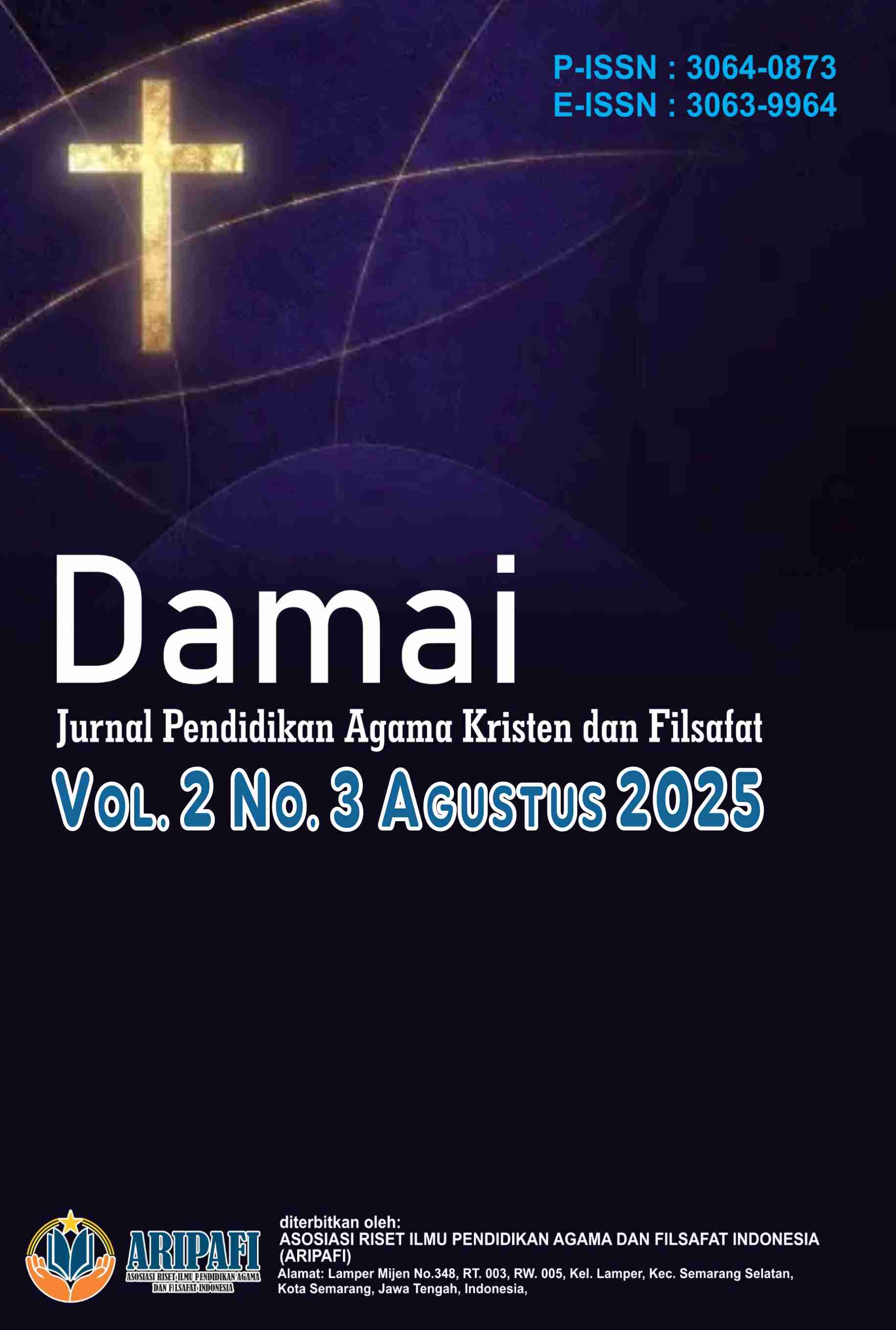 Vol. 2 No. 3 (2025)Damai : Jurnal Pendidikan Agama Kristen dan Filsafat, Jurnal ini ditujukan untuk publikasi artikel ilmiah yang diterbitkan oleh Asosiasi Riset Ilmu Pendidikan Agama dan Filsafat Indonesia, merupakan sebuah jurnal yang menyoroti pentingnya pendidikan agama Kristen dalam konteks filsafat, dengan fokus pada pencarian makna, pemahaman mendalam, dan penerapan nilai-nilai Kristen dalam mencapai kedamaian dan kebijaksanaan. Setiap edisi jurnal ini memuat artikel-artikel yang membahas berbagai aspek penting dalam pendidikan agama Kristen, sekaligus membawa perspektif filsafat yang mendalam. Artikel-artikel tersebut mencakup beragam topik, mulai dari kajian tentang nilai-nilai Kristen dalam pembentukan karakter individu dan masyarakat, hingga refleksi filsafat tentang makna spiritualitas Kristen dalam kehidupan sehari-hari. Jurnal ini terbit 1 tahun 4 kali (Februari, Mei, Agustus, dan November).