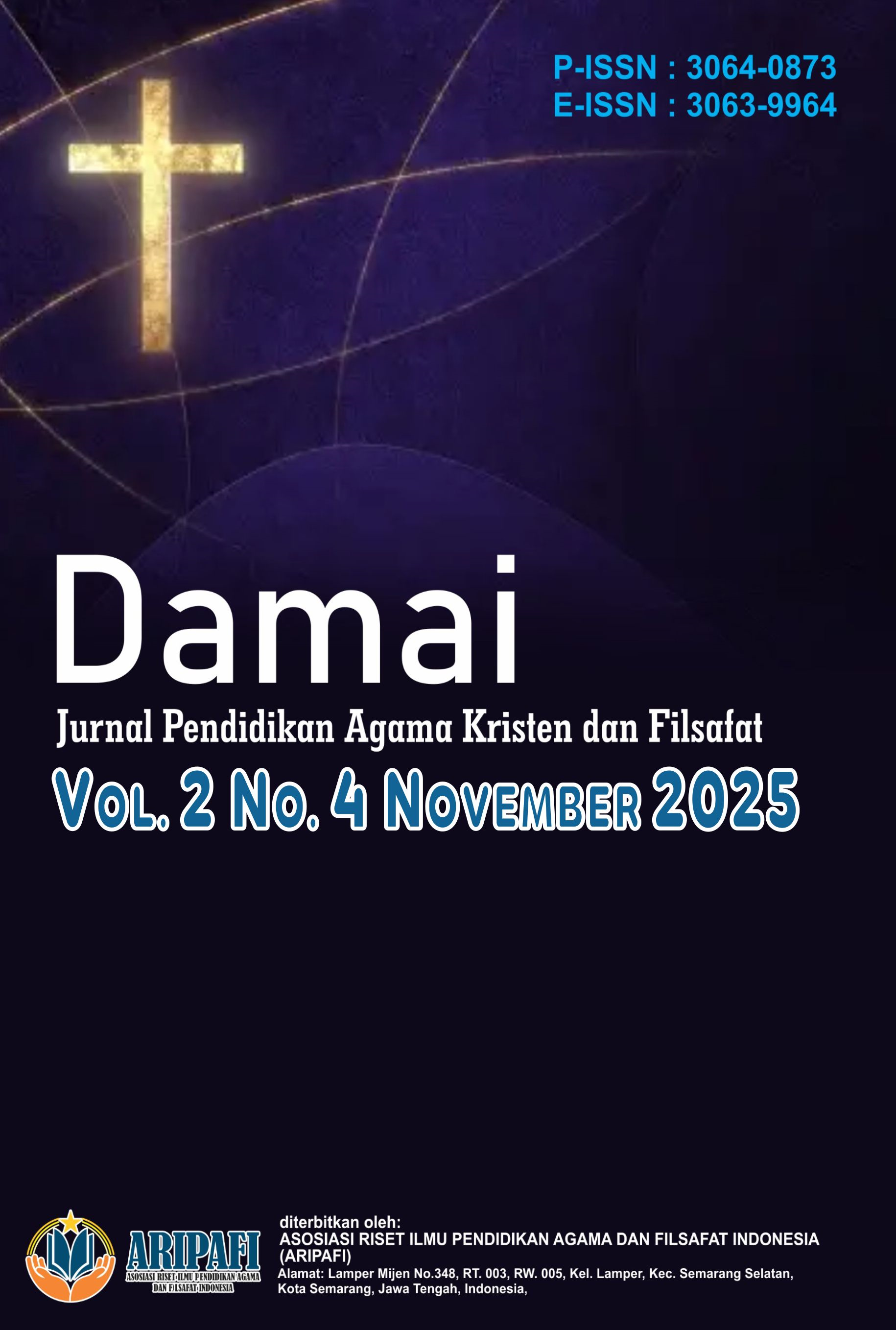 Vol. 3 No. 1 (2026)Damai : Jurnal Pendidikan Agama Kristen dan Filsafat, Jurnal ini ditujukan untuk publikasi artikel ilmiah yang diterbitkan oleh Asosiasi Riset Ilmu Pendidikan Agama dan Filsafat Indonesia, merupakan sebuah jurnal yang menyoroti pentingnya pendidikan agama Kristen dalam konteks filsafat, dengan fokus pada pencarian makna, pemahaman mendalam, dan penerapan nilai-nilai Kristen dalam mencapai kedamaian dan kebijaksanaan. Setiap edisi jurnal ini memuat artikel-artikel yang membahas berbagai aspek penting dalam pendidikan agama Kristen, sekaligus membawa perspektif filsafat yang mendalam. Artikel-artikel tersebut mencakup beragam topik, mulai dari kajian tentang nilai-nilai Kristen dalam pembentukan karakter individu dan masyarakat, hingga refleksi filsafat tentang makna spiritualitas Kristen dalam kehidupan sehari-hari. Jurnal ini terbit 1 tahun 4 kali (Februari, Mei, Agustus, dan November).
